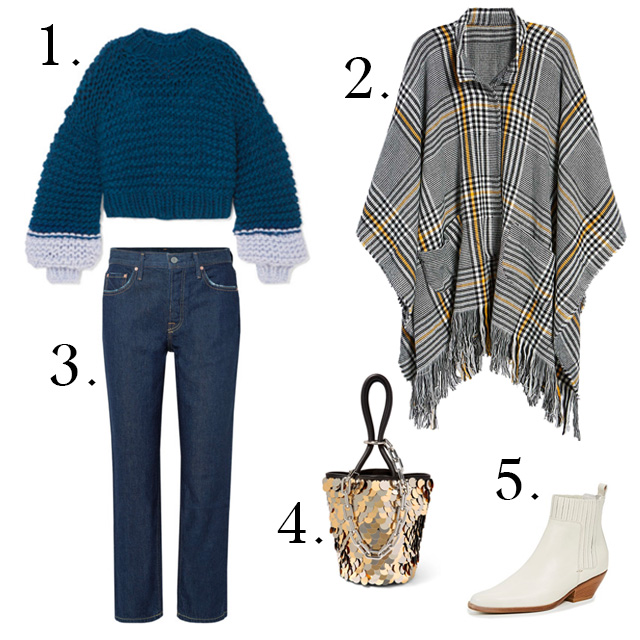 1. The Knitter sweater, 2. BP shawl, 3. GRLFRND jeans, 4. Alexander Wang bucket bag, 5. Vince ankle boots,